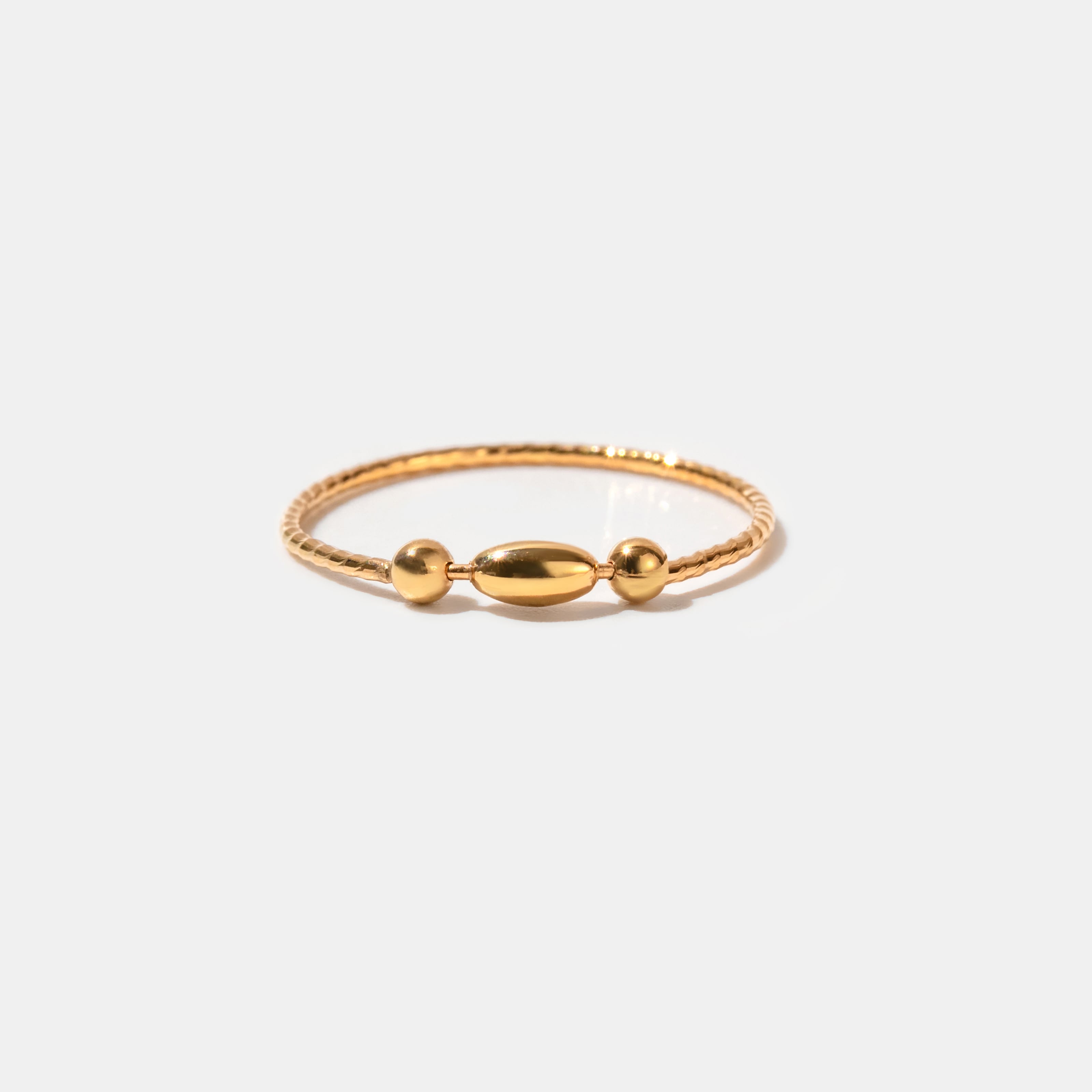 中央に個性的なモチーフを施し、細めで華奢ながらも存在感のあるデザイン。