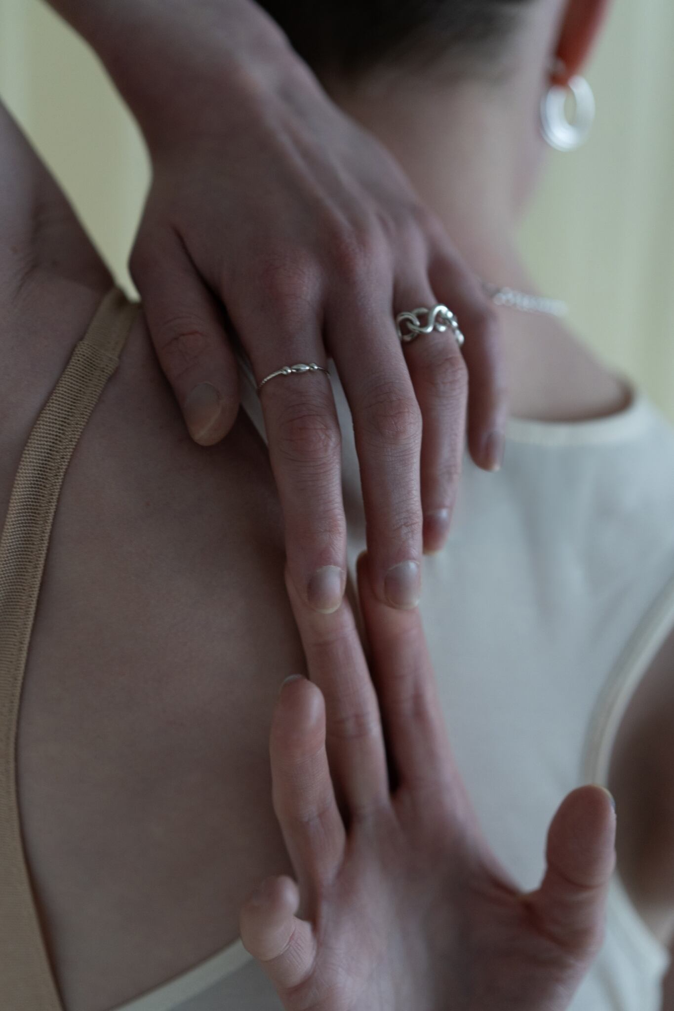 中央に個性的なモチーフを施し、細めで華奢ながらも存在感のあるデザイン。