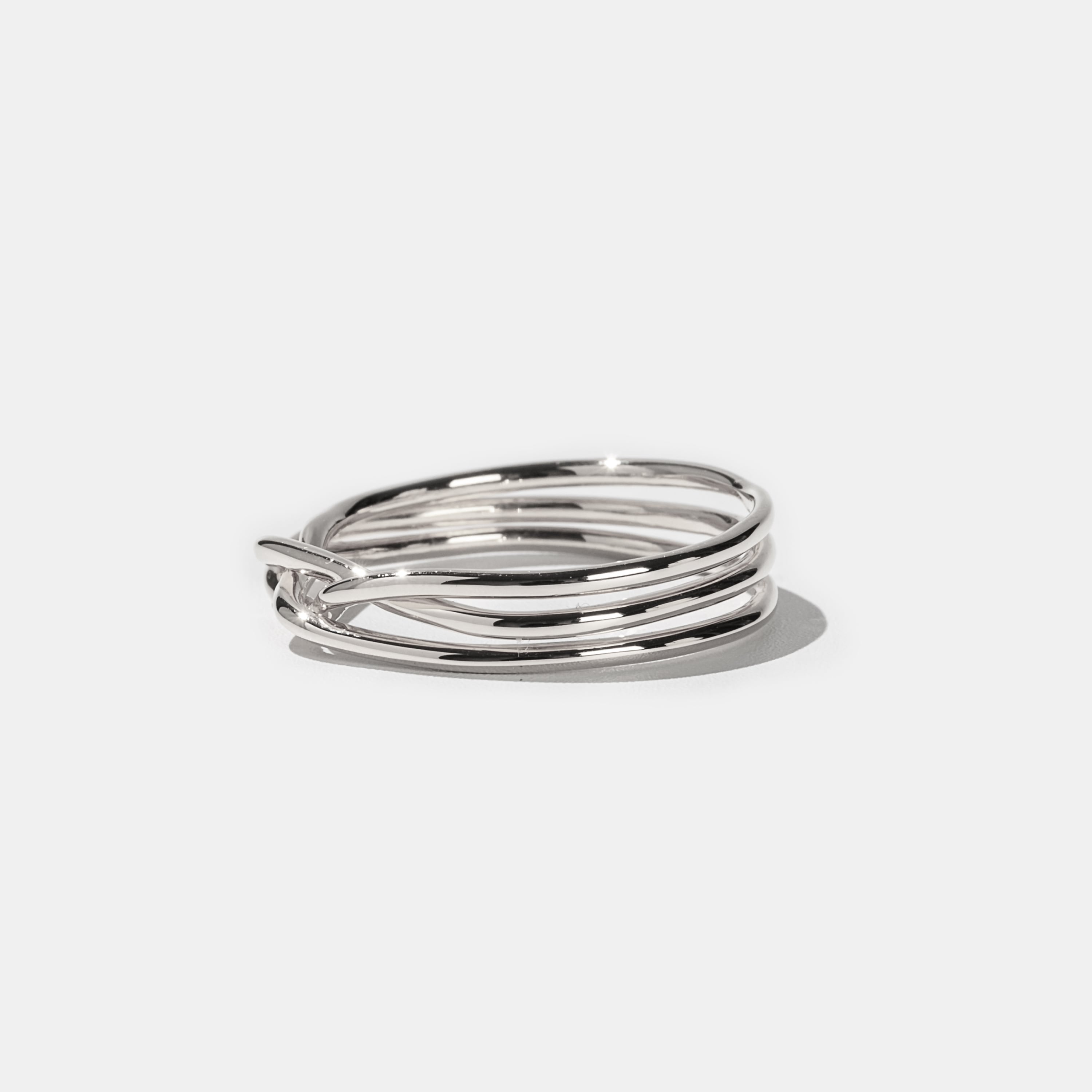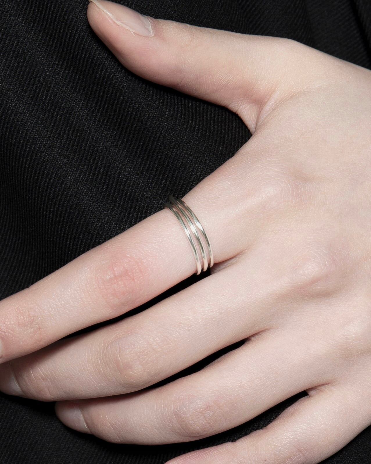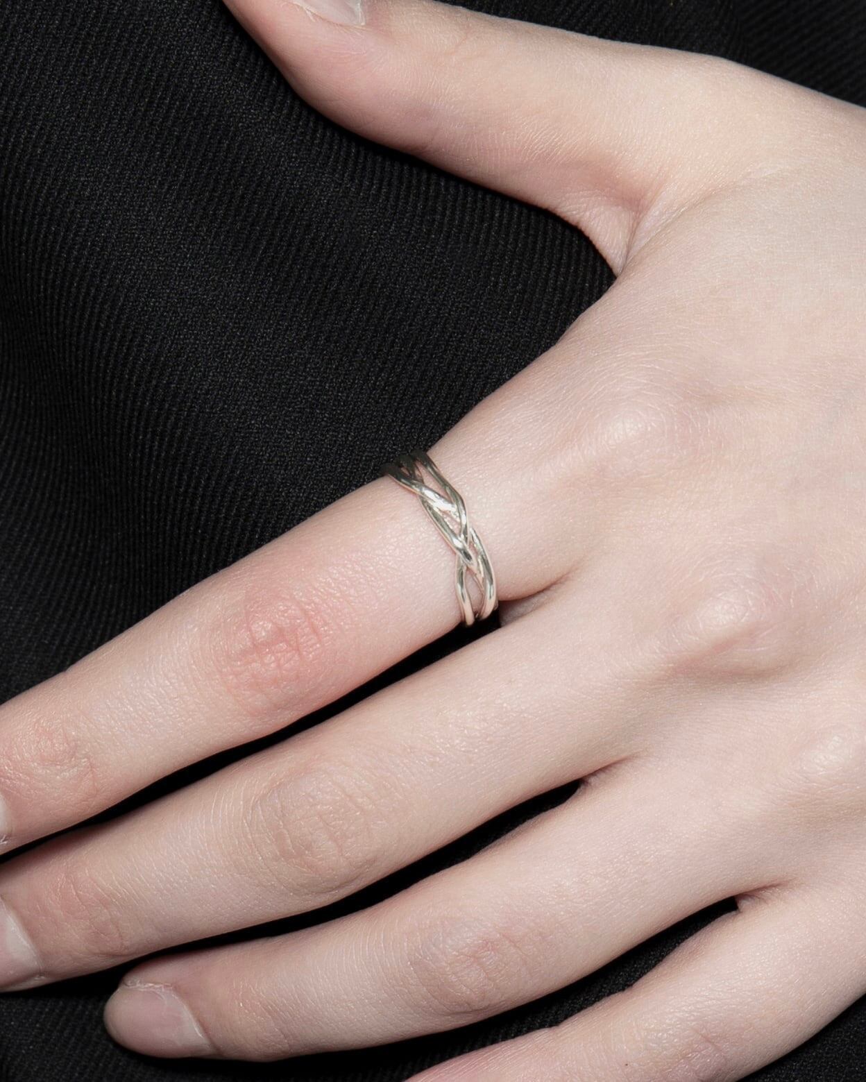 3本の線がフロントにかけて交差する造形が特徴のリング。