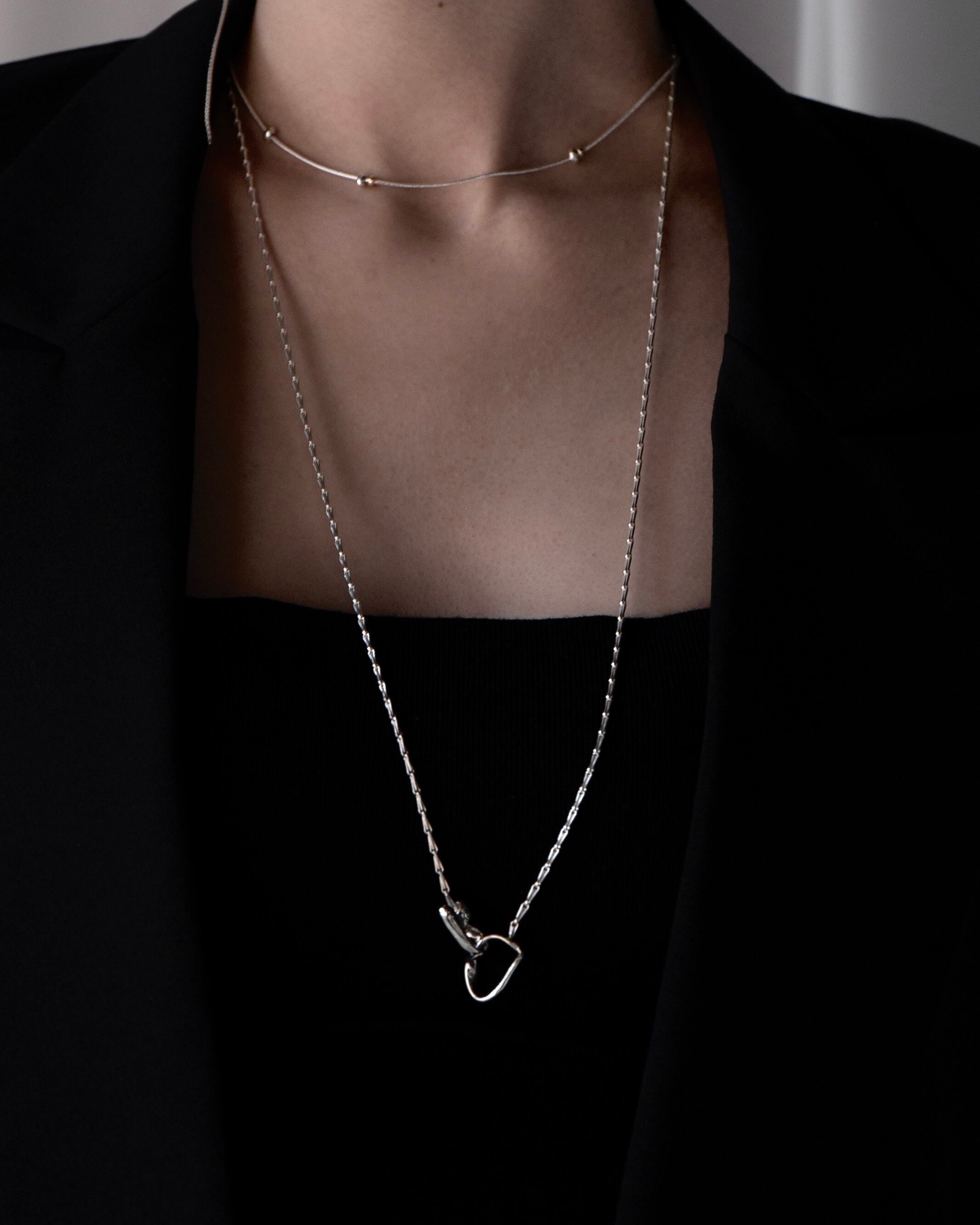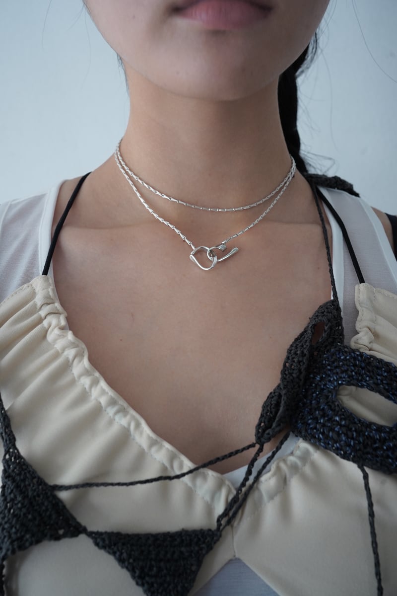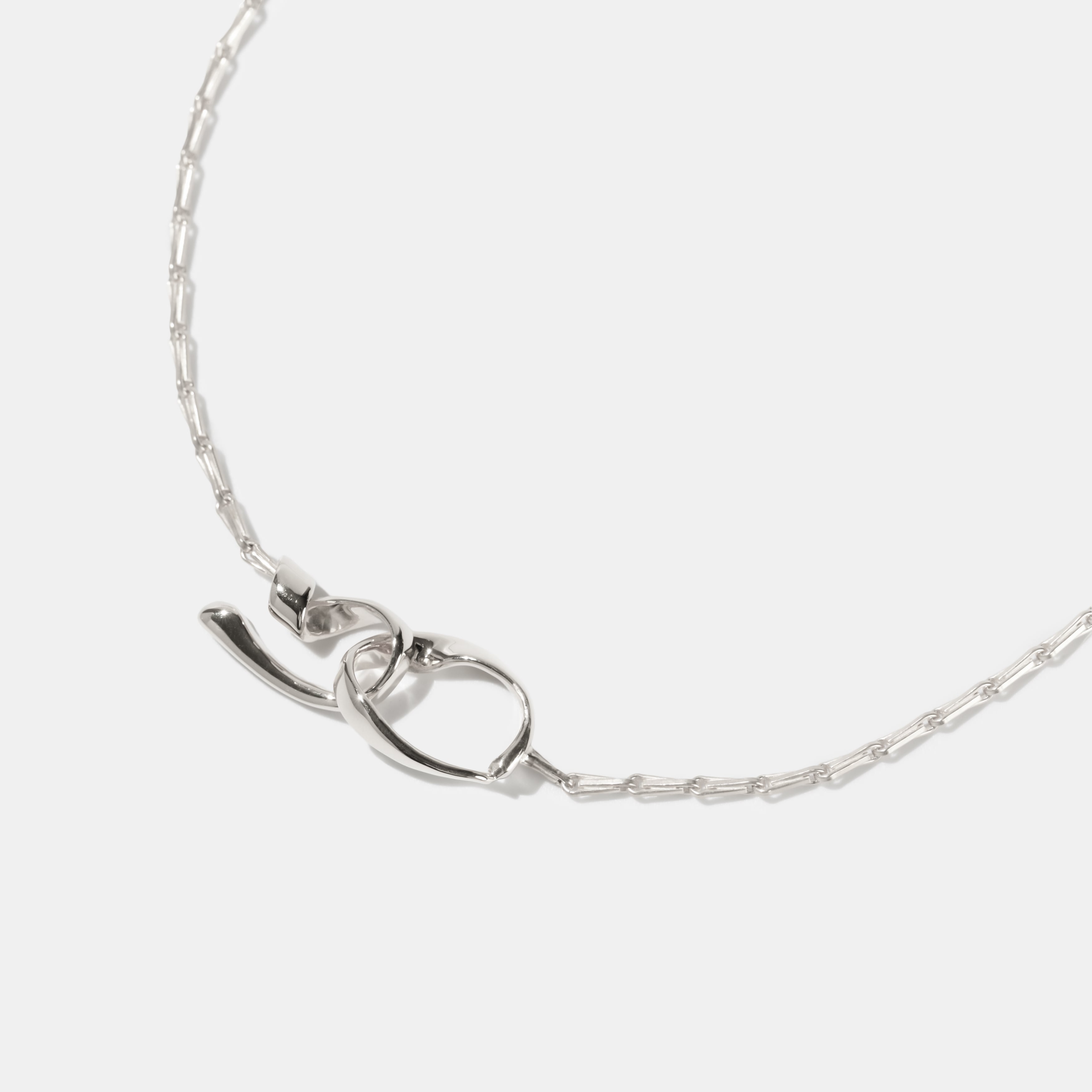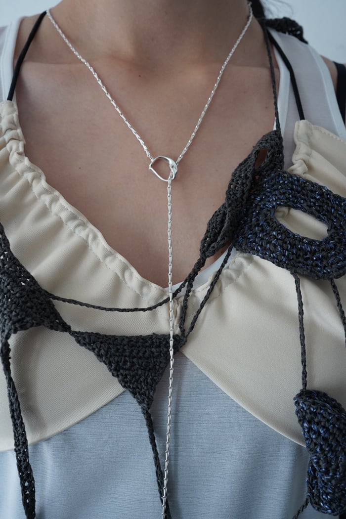 ユニークな形状のパーツが連なるチェーンと、くるりと巻き付くようなモチーフが特徴のネックレス。