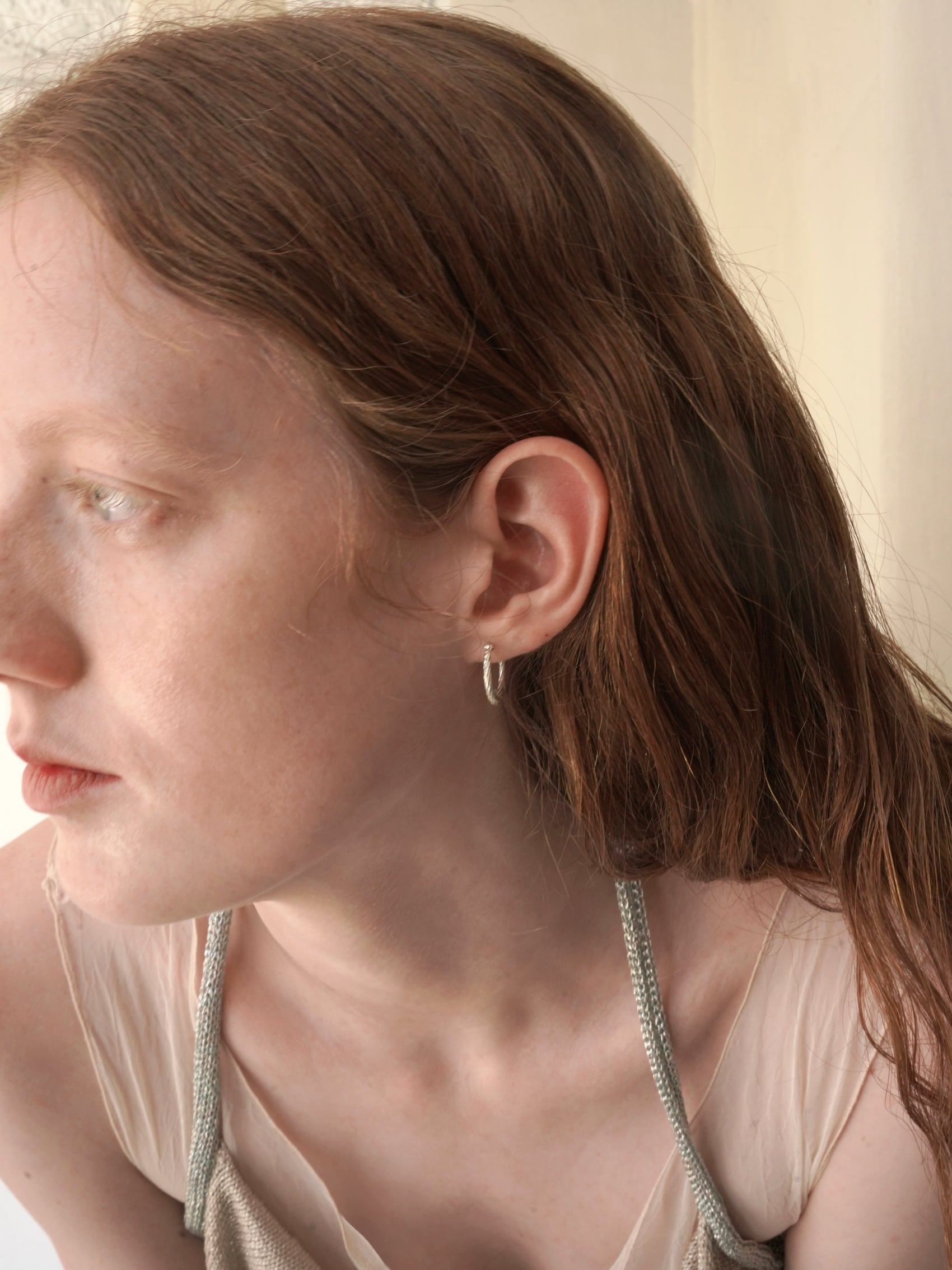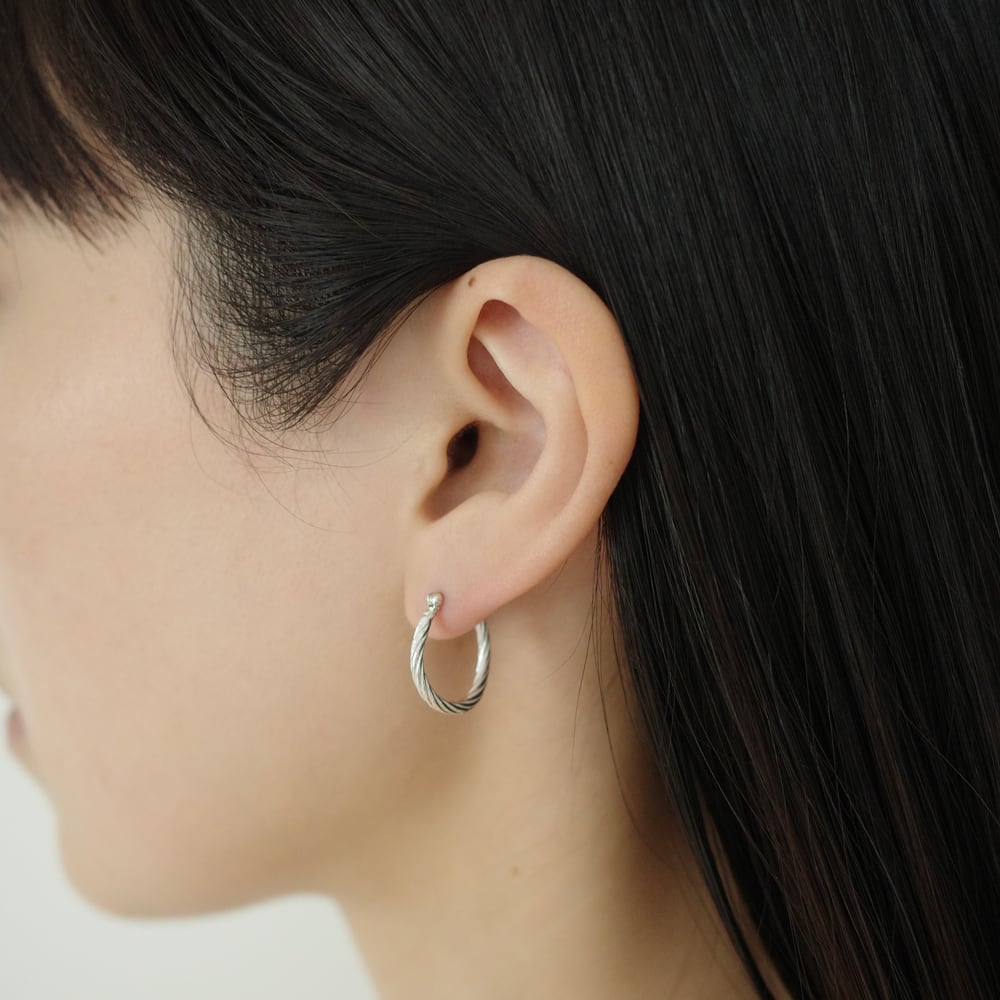 ツイストした平線が、角度によって様々な光の反射を生むサークル状のピアス。